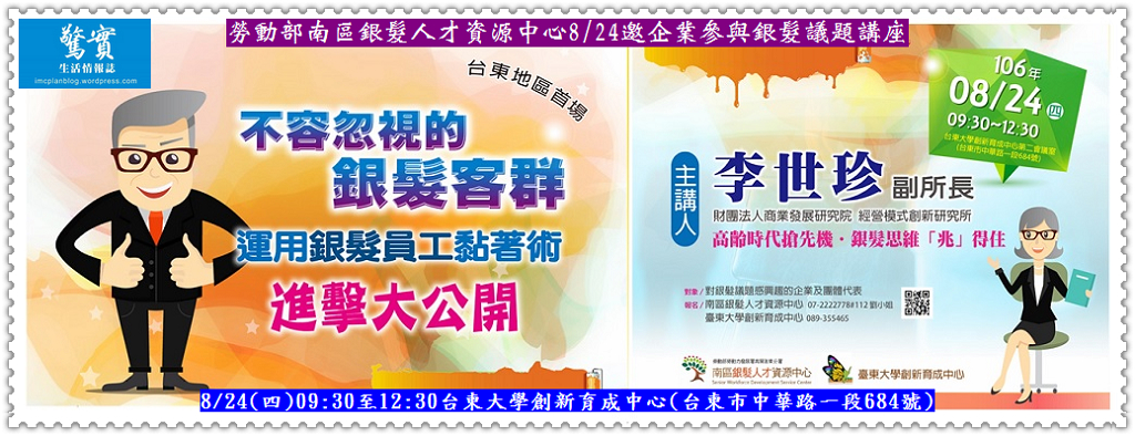 勞動部高屏澎東分署南區銀髮人才資源中心因應高齡化社會來臨提供企業新思維,8/24(四)09:30至12:30在台東大學創新育成中心(台東市中華路一段684號)舉辦銀髮議題企業講座,針對國內銀髮經濟及勞動力發展現況與高年級生重返職場優勢等議題進行專題演講,並現場與企業主討論溝通。