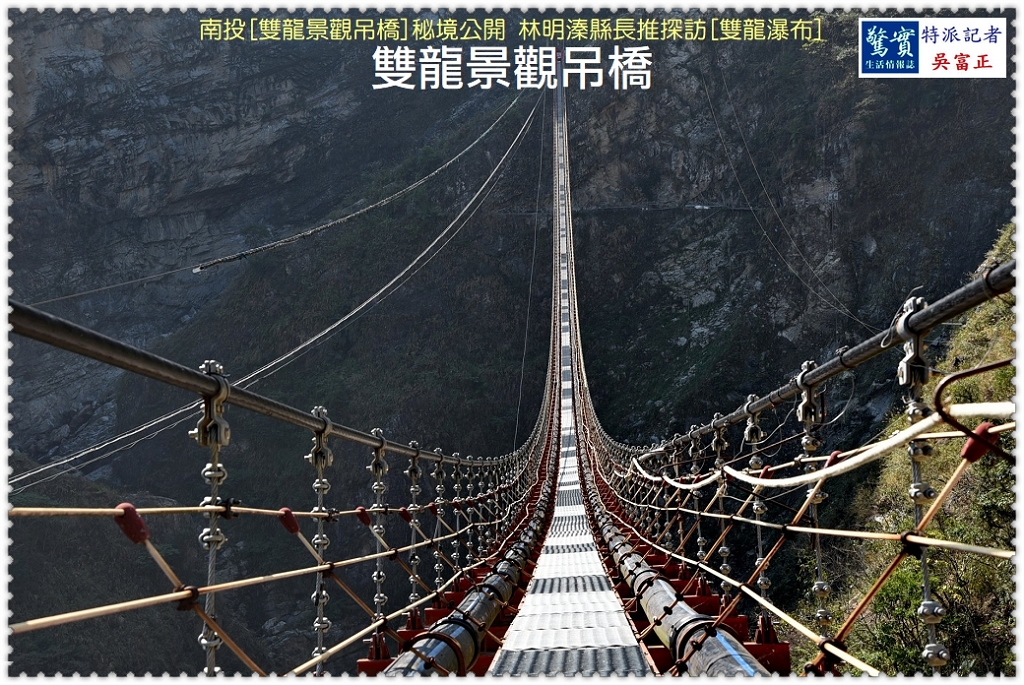 南投縣長林明溱表示,「雙龍景觀吊橋」興建在大峭壁上,橋身跨距350公尺,橋下則是讓人雙腳發麻的深谷,谷深逾120公尺,比30層樓還高,景色壯觀,加上「雙龍瀑布」終年不斷,未來將成為南投新景點。
