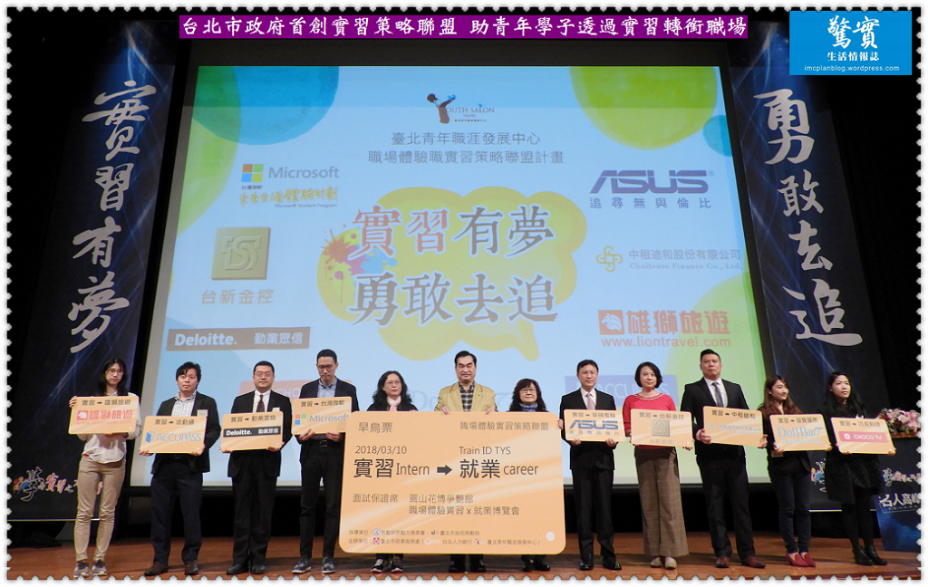 台北市政府為協助青年學子透過實習轉銜職場,創全國之先推動「職場體驗實習策略聯盟」。為宣示聯盟成立,台北市鄧家基副市長、台北市政府勞動局賴香伶局長、台北就業服務處游淑眞處長2/25邀請聯盟企業代表於福華卓越堂舉辦啟動儀式及名人高峰論壇,在現場近千名青年的見證下,與台灣微軟、華碩電腦等九家企業代表共同舉起「實習直達就業」之高鐵車票,象徵策略聯盟主打的實習無縫接軌正職、畢業即就業的優勢。