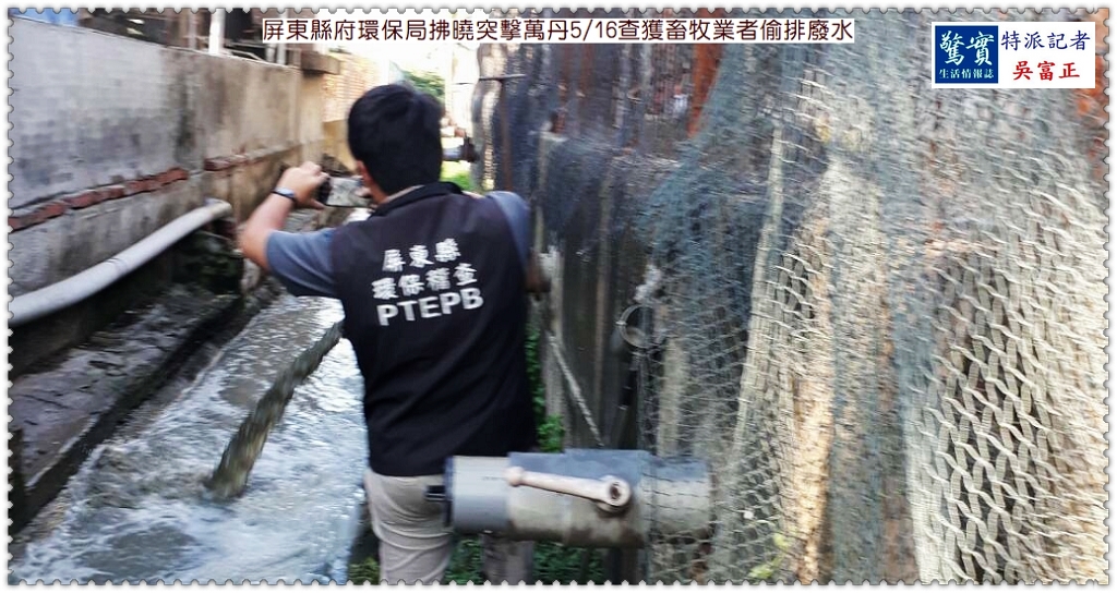 屏東縣政府環保局5/16清晨5點主動展開畜牧業突擊稽查,在萬丹鄉當場查獲業者有繞流排放(俗稱偷排)情形,依違反水污染防治法予以重罰,可處6萬元至2000萬元罰款。環保局強調,對違規業者開罰絕不手軟,尤其趁大雨或夜間偷排廢水者,一經查獲即予重罰或停工,絕不寬貸,業者切勿心存僥倖。