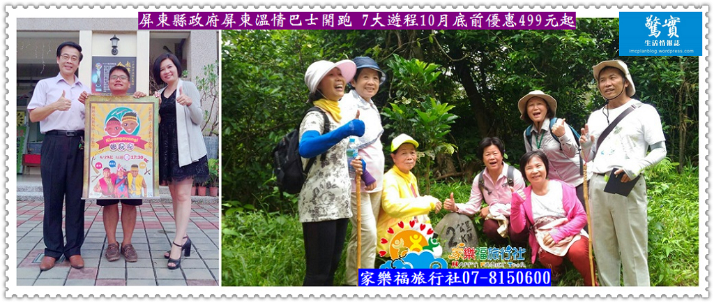 屏東縣政府觀光傳播處行銷屏東觀光旅遊,與旅遊業者合作推出2017屏東溫情巴士系列套裝行程,結合環保生態、海峽風光、養生溫泉、風味美食、多元民族文化等元素的7大遊程路線,最低只要499元起,邀請各地民眾前來體驗國境之南的好山好水。