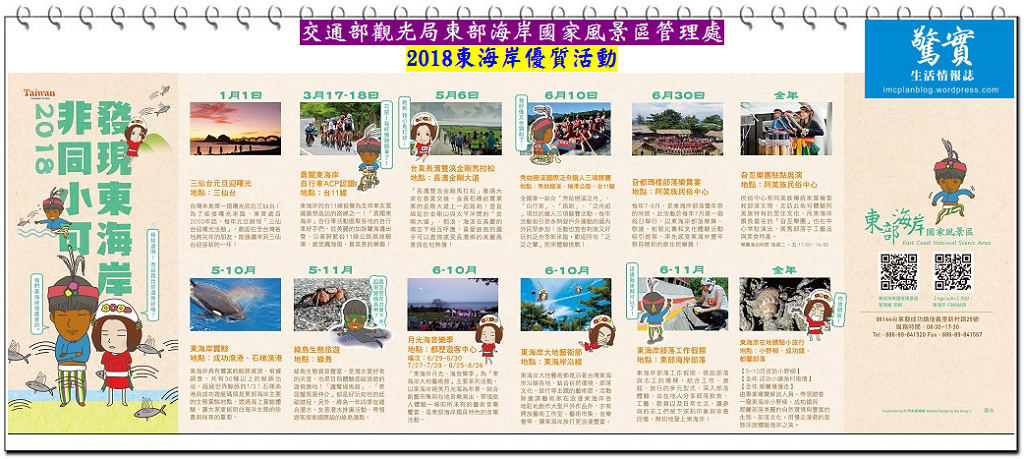 交通部觀光局東部海岸國家風景區管理處(東管處)為提供遊客貼心優質服務,特精心規劃2018年精彩系列活動,預為公佈各活動辦理期程,方便民眾規劃安排花東旅遊計畫時參考。東海岸擁有壯闊山海美景、多元樣態的人文風情,結合2018海灣旅遊年不同主題精彩豐富的生態、運動、部落、藝術系列觀光活動,繽紛璀璨的東台灣,竭誠歡迎每位旅人的到來。