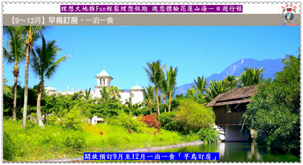 理想大地除了暑期特惠的「Fun輕鬆理想假期」和「山海一日遊」行程,即日起,更同步開放預訂9月至12月一泊一食的「早鳥訂房」,每房最低4499元起,折扣下殺45折優惠,訂房諮詢(02)2658-8181、(03)865-6789、(07)211-7997。