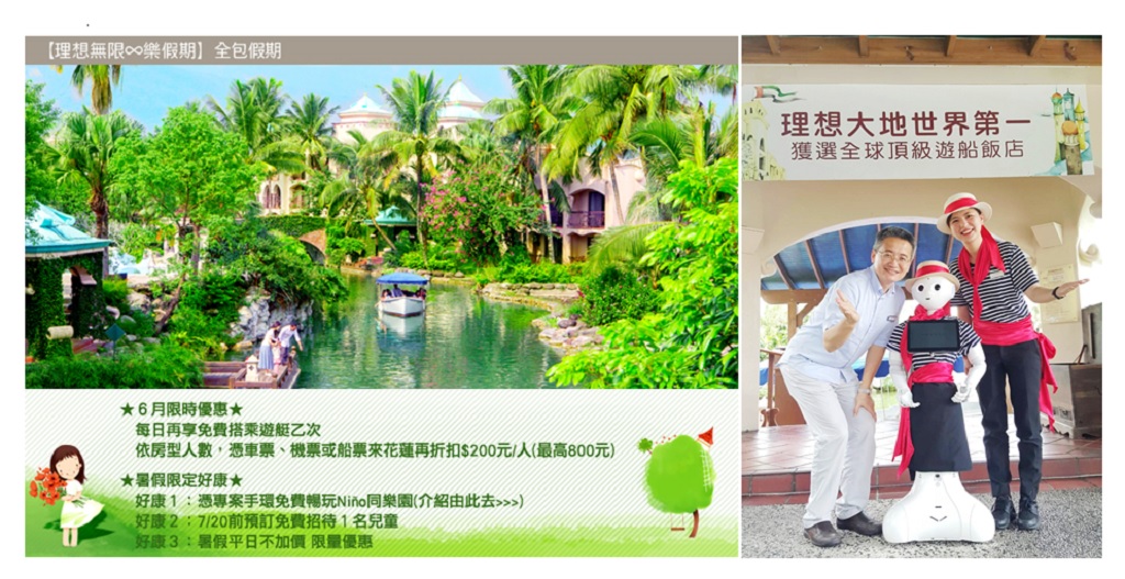 理想大地渡假飯店康富雄總經理表示,理想大地2017年入榜知名訂房網盤點「全球七大遊船體驗旅宿」,於6月中旬引進具有AI人工智慧與情感引擎的pepper,用表情、動作、語音與人類交流,與旅客進行更多有趣親密的互動。pepper未來將專職接待每位造訪飯店旅客,除了介紹飯店故事、住房優惠,交通車時程、還能查詢飯店內外大小的活動,在互動過程中統計各式的數據,讓飯店更了解旅客在入住期間的需求,進而提供更多不同的服務。