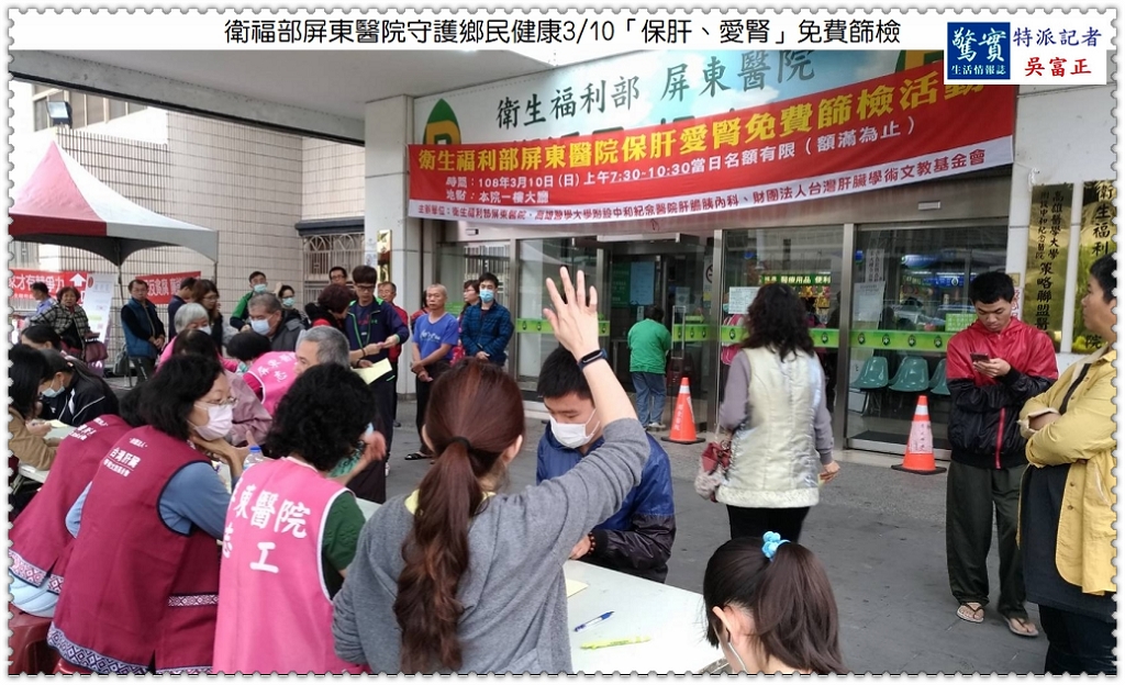衛生福利部屏東醫院為守護鄉親健康,回饋民眾對屏醫支持,與高雄醫學大學附設中和紀念醫院肝膽胰內科、財團法人台灣肝臟學術文教基金會3/10共同舉辦保肝愛腎免費篩檢活動,同時亦舉辦政風單位之全民廉政宣導,近六百位民眾扶老攜伴排隊參與。
