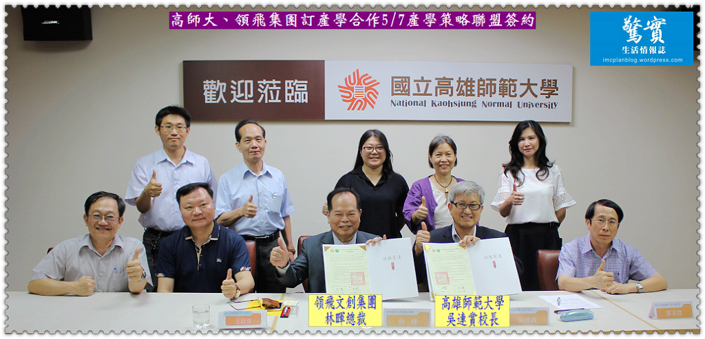國立高雄師範大學吳連賞校長與5/7與領飛無限文創集團林暉總裁簽訂產學策略聯盟,雙方均有高階主管出席與會,分別有高師大王政彥副校長、廖本煌副校長、唐硯漁總務長兼文創中心主任、藝術學院姚村雄院長、謝建元研發長、楊明迭主任等10位主管,以及領飛無限文創集團劉應鐘總導播、陳翠蘭總編輯、巫青姿總監、廖惠玲主編、孫嘉玲主任等8位主要幹部,本次簽約旨在建立與強化雙方於生技、文創、美術、雲端影音等技術上的產學合作關係。