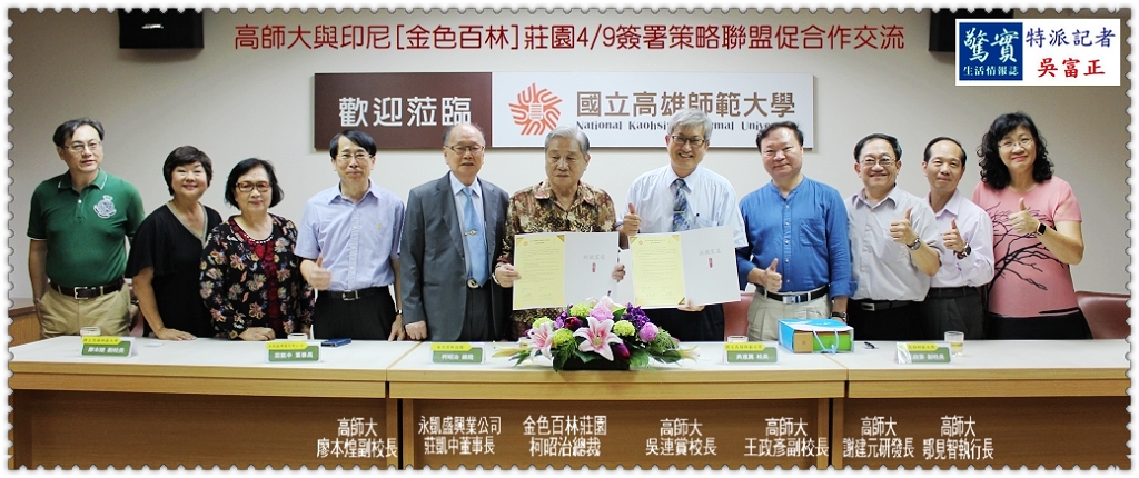 國立高雄師範大學4/9與印尼金色百林莊園簽署策略聯盟協議書,由高師大吳連賞校長及金色百林莊園柯昭治總裁代表雙方簽署,雙方就產學合作、人才培育、提供教師參與產學合作與學生實習見習機會等內容,進行具體合作與交流。分別邀請到高師大王政彥副校長、廖本煌副校長、謝建元研發長、公關鄂見智執行長、永凱盛興業公司莊凱中董事長、莊岳霖協理、雄女林香吟校長及楠梓特殊學校聶惠如校長等共同見證觀禮。