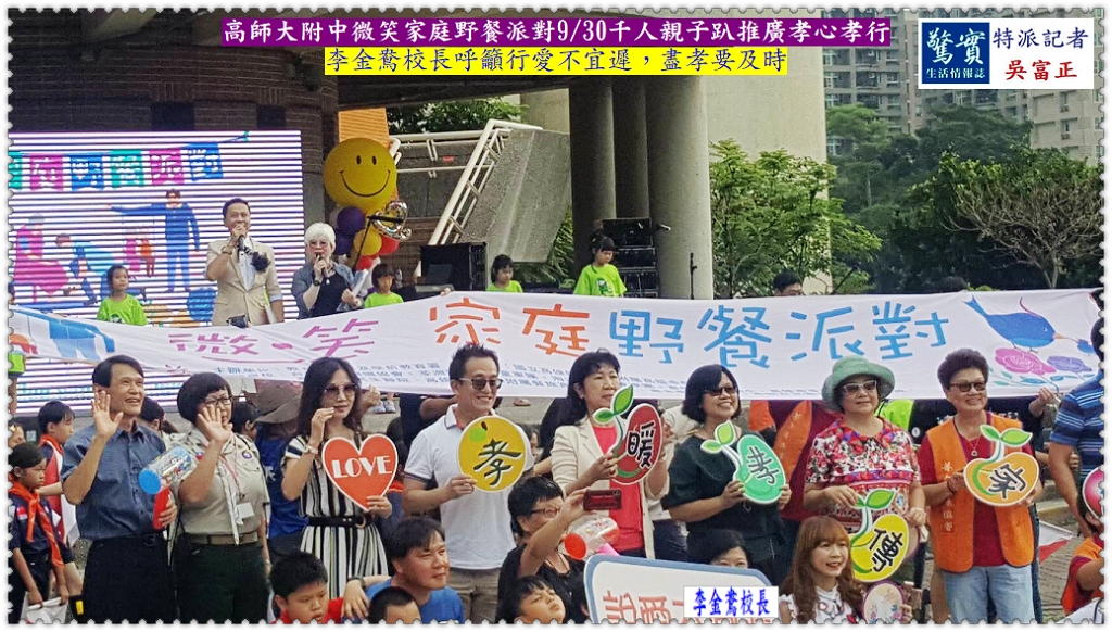 國立高雄師範大學附屬中學9/30下午於高師大附中廣場舉辦「微笑家庭野餐派對」活動,計有上百組家庭超過千人齊聚參加,每塊野餐墊上都有著一個家庭的故事,親子談笑互動的畫面,溫馨暖心滿溢。