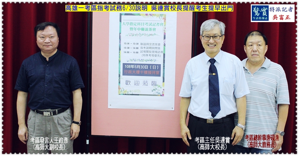 國立高雄師範大學負責今年度高雄一考區「大學入學考試中心指定科目考試」試務工作,本項指考時間為7/1至7/3,共分物理、化學、生物、數學乙、國文、英文、數學甲、歷史、地理及公民與社會等10個考試科目。6/30舉辦試務說明會,由兼考區主任吳連賞(高師大校長)主持,兼考區發言人王政彥、兼考區總幹事唐硯漁、主任書秘黃有志及公關執行長鄂見智等陪同出席,會後由兼發言人王政彥陪同媒體前往考場教室巡視,當面瞭解考生及家長需求。