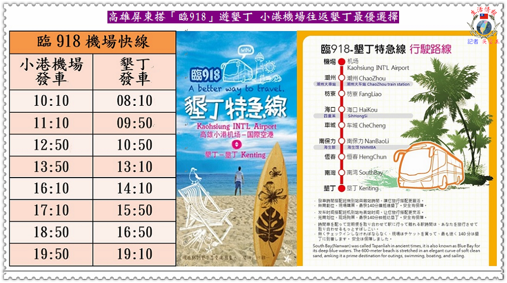 高雄市區監理所冬啟程所長表示,【臨918】也停靠潮州火車站,民眾可搭火車至潮州站,再轉乘【臨918】路線至墾丁;高雄地區民眾可搭乘捷運紅線到高雄國際機場站轉乘,另外屏東地區民眾出國亦可搭乘【臨918】路線,到小港機場出境,大大減少了旅運時間。