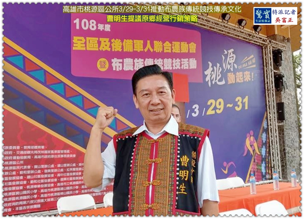 高雄市桃源區公所謝英雄區長為推動布農族文化體育及觀光產業,凝聚區內族人的認同與團結,並且為突顯桃源區在地山區自然環境生態及產業發展成果,結合在地文化、休閒推出農特產品整合活動,更提供遊客、國人休閒度假的好去處,3/29至3/31於雅你綜合運動場舉辦「108年度全區及後備軍人聯合運動會暨布農族傳統競技活動」;「中華台灣少數民族文旅事業交流協會」曹明生會長受邀參與3/30下午活動開幕,同時關心原住民文化體育活動、觀光產業行銷效益。