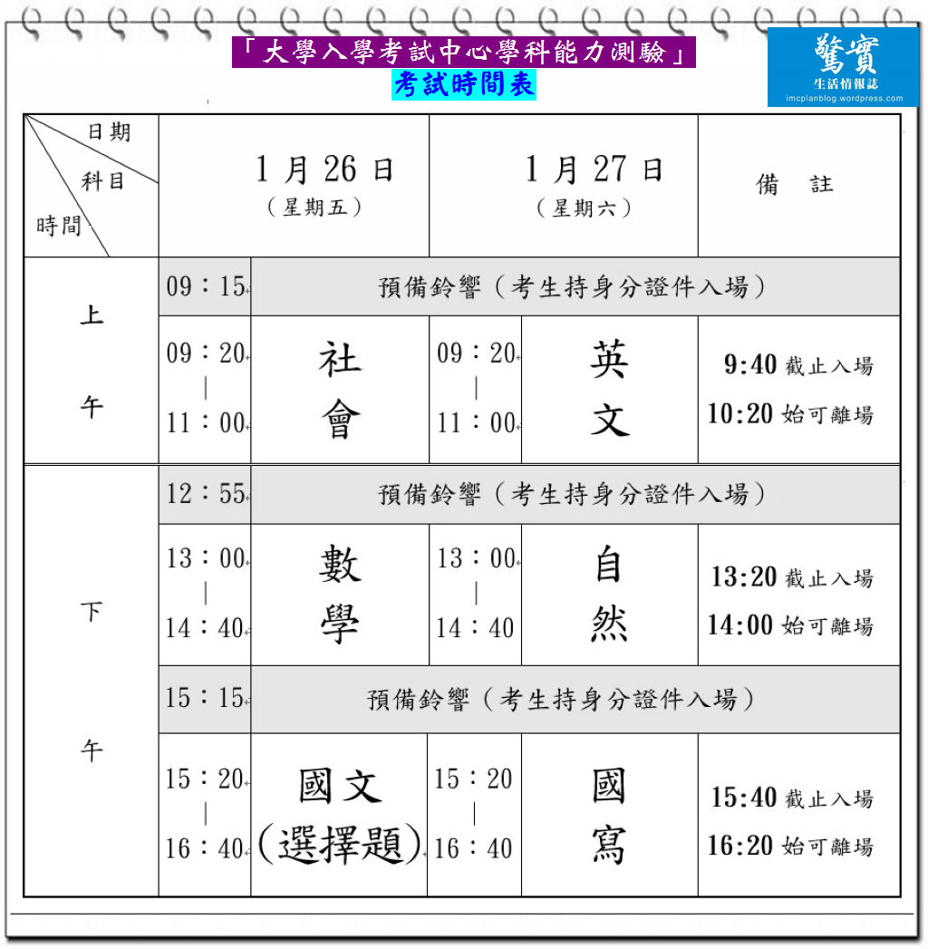王政彥副校長提及,今年考試不同於往年,包括:大考中心已取消准考證,學生必須持符合簡章規定之5種有效身分證件(國民身分證、附有照片足資證明身分之全民健康保險卡、駕駛執照、護照、居留證)之一的正本應考。另國文考科及「國學」考試時間為80分鐘外,其餘各科均為100分鐘。