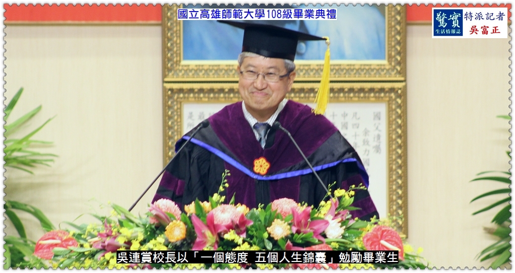 吳連賞校長致詞時,特別以「一個態度,五個人生錦囊」來期勉所有畢業生。所謂「一個態度」就是「執著」的態度。勉勵大家,永遠懷抱熱情,堅持你的理想,培養最佳的人際互動關係,永遠不斷的永續學習,你才會超越自我、突破自我、組織自我,開創美滿的人生。五個人生錦囊分別是:一、學習高師大全國校友總會長林進榮總裁成功祕訣:要為成功找方法,不要為失敗找理由,同時用合法手段,把不可能化為可能。二、要結交兩個最好的朋友,一個是繼續多多利用圖書館,另一個最好的朋友是運動場。三、要培養兩種基本功夫,其一是建構好你的「本事」,另一個基本功夫是善盡本份。四、要深化做人的道理,並努力實踐。五、要會思考、辨是非、有教養。