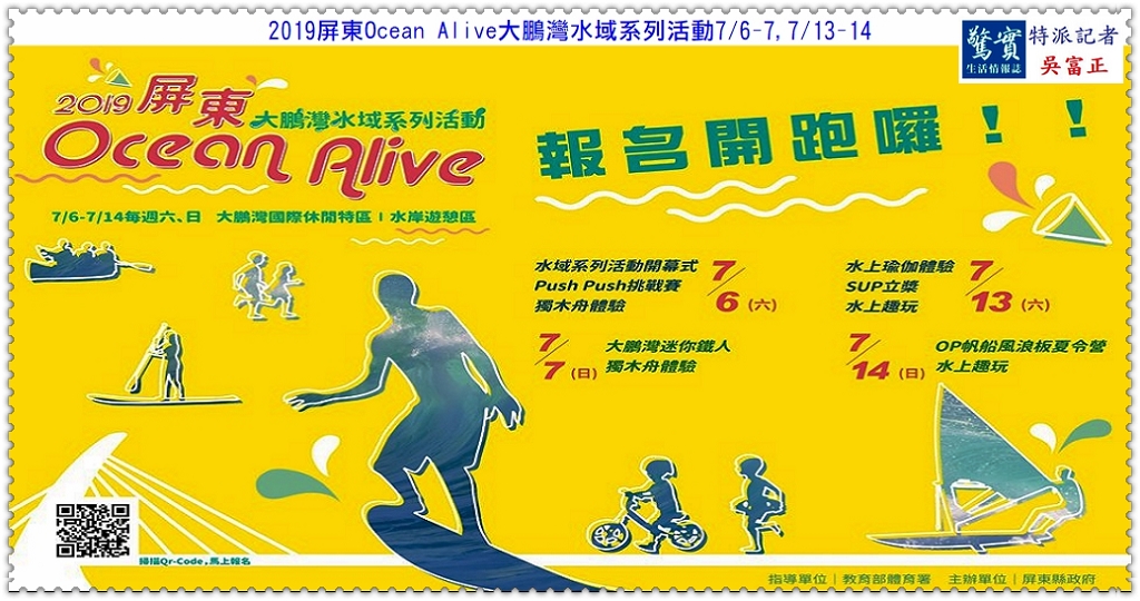 屏東縣政府為提倡健康安全的水上休閒活動,每年規劃辦理大鵬灣水域活動,希望透過各種系列活動,增加水域活動的人口,並提升水中安全認知及自救能力,擴展民眾體驗水域活動機會,培養親海知識與水上運動能力,更進而期望將大鵬灣打造成為南台灣多元遊憩新品牌,讓國內外水域活動人士,皆以屏東大鵬灣為首選。7/6、7/7、7/13、7/14「2019屏東Ocean Alive大鵬灣水域系列活動」即日起開始報名,活動皆為推廣性質,民眾只需少許費用,即可體驗各項刺激的水上活動。