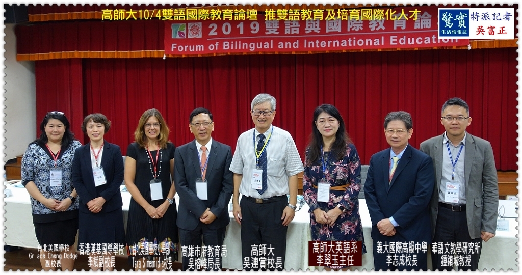 國立高雄師範大學為配合政府發展2030年雙語國家政策,推動雙語教育及培育國際化人才,10/4與高雄市政府教育局於高師大文學院小型劇場,舉辦「2019雙語與國際教育」論壇,由高師大吳連賞校長與高雄市府教育局吳榕峯局長共同主持開幕儀式。會中邀請香港漢基國際學校李斌副校長、義大國際高級中學李志成校長、台北美國學校副校長Grace Cheng Dodge博士及台北美國學校小學部校長Tara Simeonidis女士等發表雙語及國際教育辦學經驗,介紹雙語課程規劃、教學實施情形,作為未來國際雙語師資培育和培訓計劃推動和執行之參考,共同為台灣未來推動雙語教學,挹注豐沛且創新的能量。