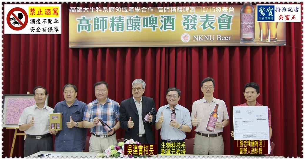 國立高雄師範大學10/15由吳連賞校長主持「高師精釀啤酒」發表會,此產品源自生物科技系謝建元教授為提升現場學生學習成效,進而與業界產學合作,跨領域攜手推出的新產品。