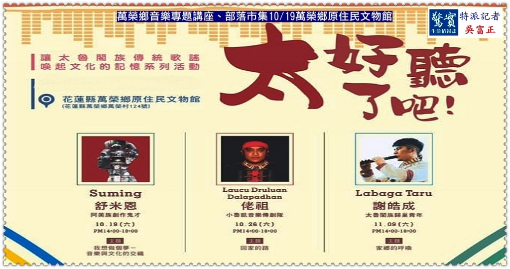 萬榮鄉公所10/19(六)10:00於萬榮鄉原住民文物館停車場辦理「部落市集」、14:00原住民文物館二樓辦理「『太』好聽了吧!讓太魯閣族傳統歌謠喚起文化的記憶系列活動」,透過首波系列活動,邀請他族從事部落在地產業及推動傳統歌謠文化工作者,分享其經驗並間接刺激萬榮鄉對於音樂文化有興趣者對於族群音樂的想像,藉此嘗試以當代的思維與傳統歌謠做結合,產出不同風貌的族語歌曲。