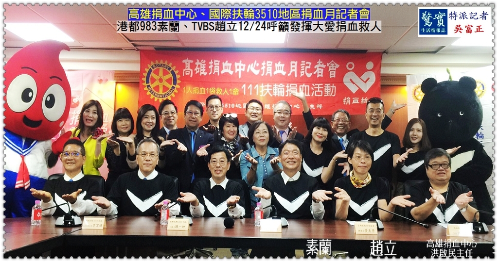 高雄捐血中心捐血月12/24記者會由高雄捐血中心洪啟民主任與國際扶輪3510地區張鴻熙總監帶領全體扶輪社友發佈扶輪年度主題「扶輪連結世界」,宣導扶輪捐血活動自12/24至109年3/7,共計發動44場捐血活動,邀請市民朋友踴躍加入捐血救人行列,一同做個快樂的捐血人。各項活動詳情請至高雄捐血中心官網捐血行事曆查詢。