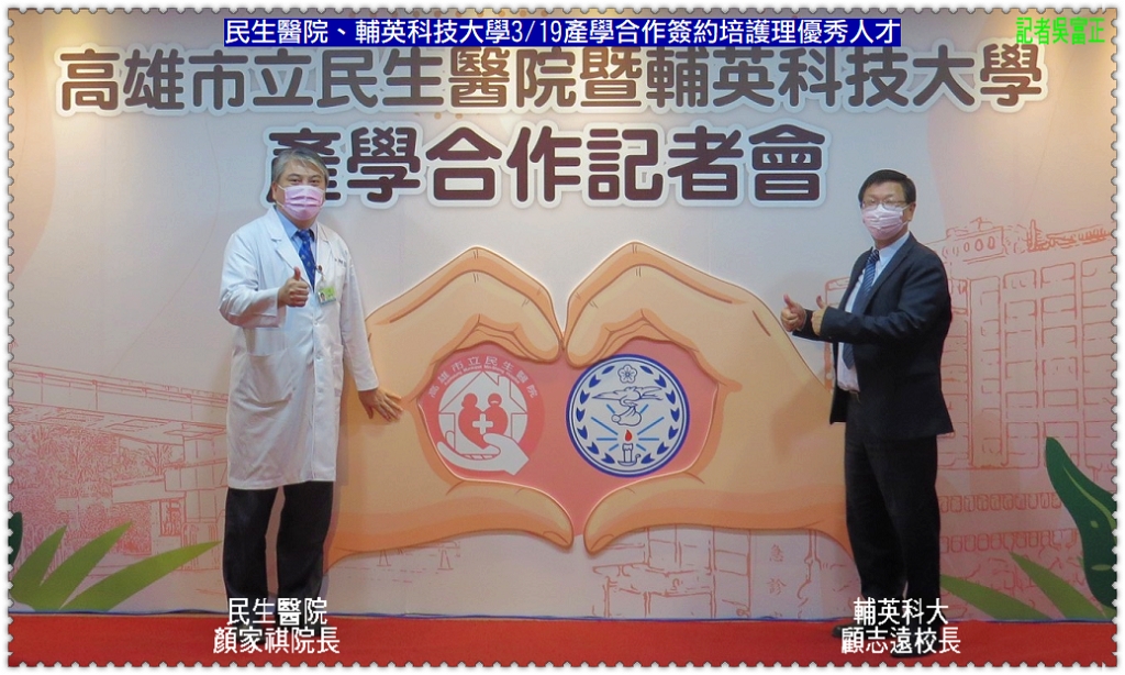 高雄市立民生醫院顏家祺院長與輔英科技大學顧志遠校長3/19舉辦「院校產學合作」簽約儀式,象徵彼此更為緊密的合作關係。因應現今高齡化社會,醫療需求日益增加,遂而衍生出醫療人力缺口逐年擴大,往往無法及時補足,為有效改善醫護人力短缺之問題,提前培育莘莘學子為醫院所需之人才儼然成為未來發展之方向,期望藉由產學合作模式鏈結優秀人才及醫界資源,建置完善的醫療環境及提升醫療照護品質。