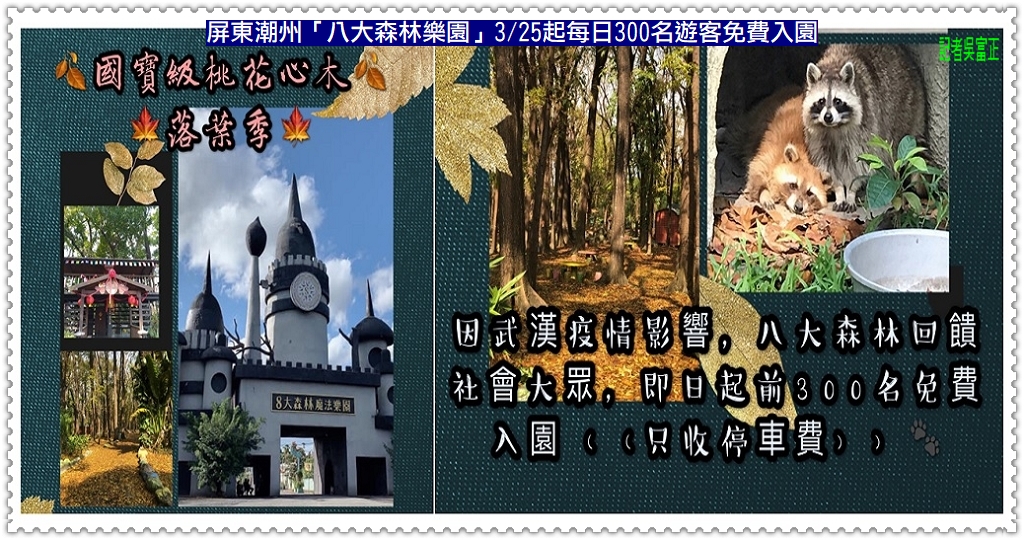 屏東潮州「八大森林樂園」有感在疫情持續下民眾的無奈,希望能躲開市區的喧鬧與密閉空間,3/25起,每日免費開放300名遊客入園散心,體驗這份浪漫及餵食可愛的浣熊夫婦。