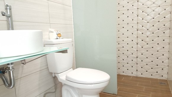 大大的房間裡會有訪客需要的盥洗備品,愛地球的我還是在這裡呼籲大家自己帶,健康衛生又環保。浴室的大片壁磚,是特殊選擇,不細看只覺得協調,識貨就明白屋主很用心。