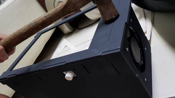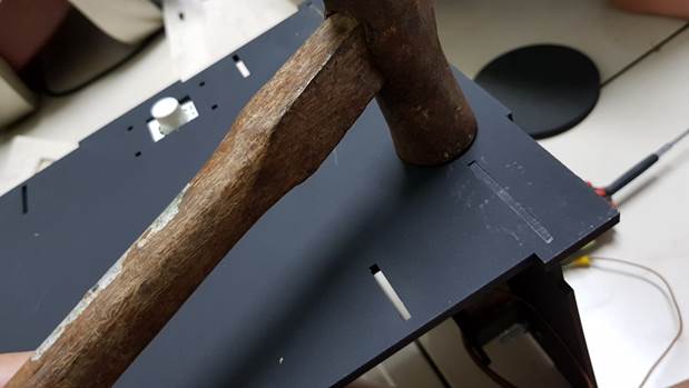 組裝大片合板的時候,建議一個秘密武器:就是鐵錘!當然這個要小心使用,有時候在大結構卡榫不好處理的時候,又不想用美工刀破壞木板那你可以用鐵鎚輕輕的敲,讓木板完全吻合鑲入,就不會影響到後續我們要裝過濾門扇的小小木枝條。